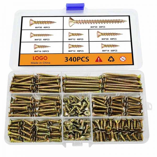M4 Flat Head Wood Screws Assortment Kit 340 Pcs,Phillips Drive Countersunk Flat Head Self-Tapping Wood Screws,Yellow Zinc Plated Finish Screw Kit,Self Tapping Screws for Metal,Full Thread