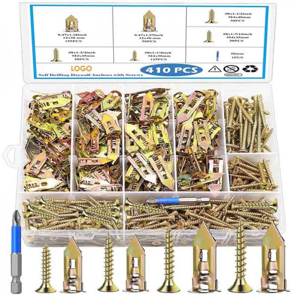 410 PCS Self Drilling Drywall Anchors with Screws Kit - 2 Sizes Sheetrock Anchors & 4 Sizes Zinc Expansion Screws,2025 Upgraded Zinc Plated Steel,No Drill Needed, Holds Up to 66LB on Walls.