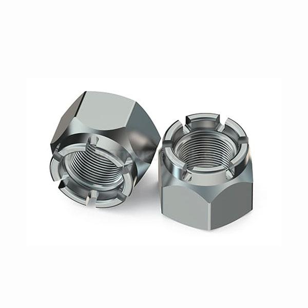 Slotted nuts, also known as castellated nuts, have grooved heads that align with holes in the mated bolt to accept the insertion of a cotter pin, locking the nut in place. They are commonly used to ensure that shaft components in certain automotive assemblies do not separate or to maintain machine settings in manufacturing environments.