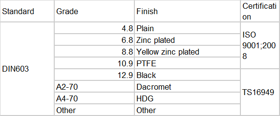 This standard specifies DIN603 carriage bolts with metric threads M5 to M20 of product grade C.DIN standard carriage bolt can be made of carbon steel,stainless steel,alloy steel or other materials.Our carriage bolt has been certificated by ISO 9001 and TS16949.