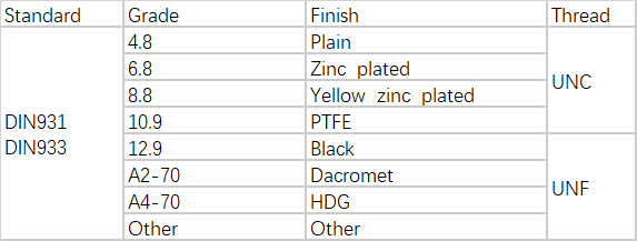DIN standard hex bolt includes two kinds of type,DIN931(half thread) and DIN933(full thread).All the DIN hex bolt can be made of carbon steel,stainless steel,alloy steel and other materials. The size can be standard or customized.The DIN hex bolt usually used in the machinery and equipment, construction, automobile, railway and other industries.